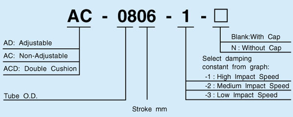 S Series-Non-adjustable Shock Absorbers, each type has only one unique orifice arrangement. Surface treatment: Nitriding treatmentSC Series-Non-adjustable ( Self-compensation) Shock Absorbers, Eeach type has 3 different orifice arrangement. Surface treatment: Nickel plated: SC0806, SC1005, SC1008, SC1210, SC1412BS; others are black anodized.FC Series-Adjustable Shock Absorbers, Surface treatment black anodized.SCS Series-Shock Absorbers used for stop cylinders. Surface treatment black anodized.SCD Series-Double cushion shock absorbers. Surface treatment black anodized.Special surface treatment can be arranged upon request, such as: QPQ.
