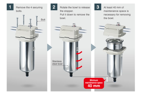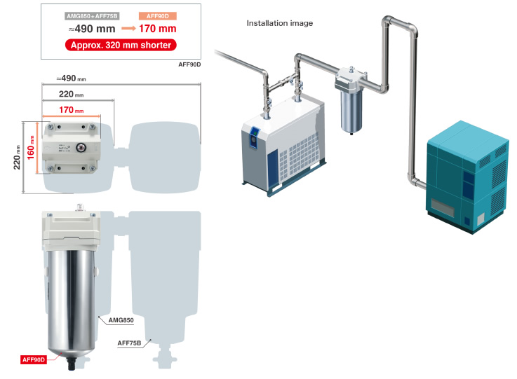 Water droplets and solid particles can be removed with just one AFF. A separate filter for removing water droplets (water separator, AMG series) is not necessary any more. Space and piping work are reduced.
