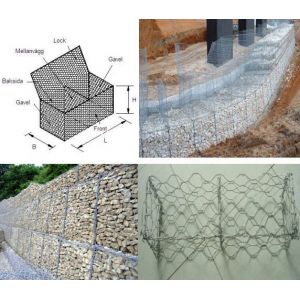 Gabion box is the most common type of gabion structures. It is a rectangular woven wire mesh basket filled with rock to form flexible, permeable, monolithic structures such as retaining walls for commercial, industrial and road projects. They are also used for erosion control, bank stabilization, architectural and urban design features, noise attenuation structures and weirs.