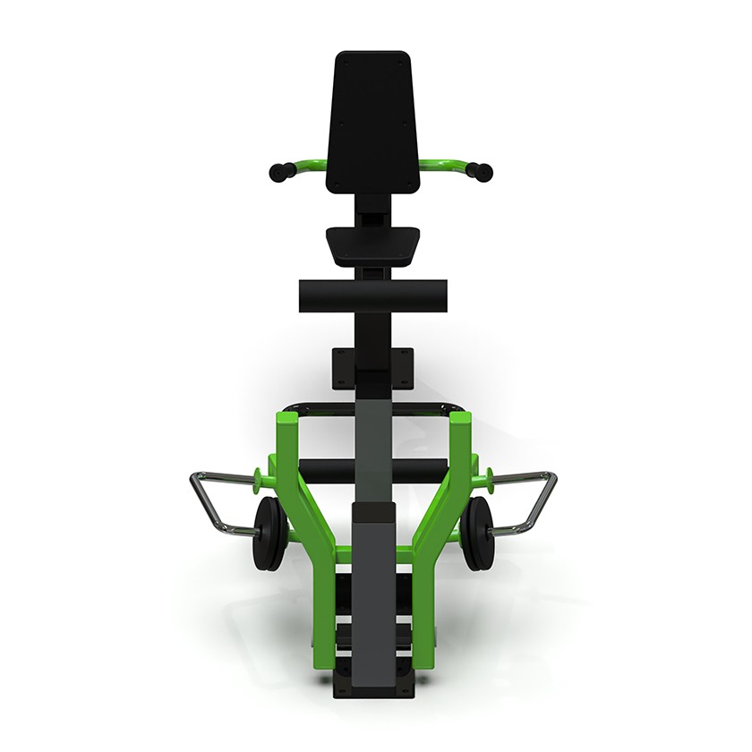 This outdoor fitness equipment features a commercial-grade steel structure, utilizing common metals and a black powder coating similar to indoor gym equipment. It is designed with a durable, vandal-resistant shell housing an isokinetic spring resistance system. Additionally, it includes a comfortable saddle, backrest, and non-slip handles and foot pedals. These qualities make the Leg Press a more durable and high-quality outdoor fitness solution.